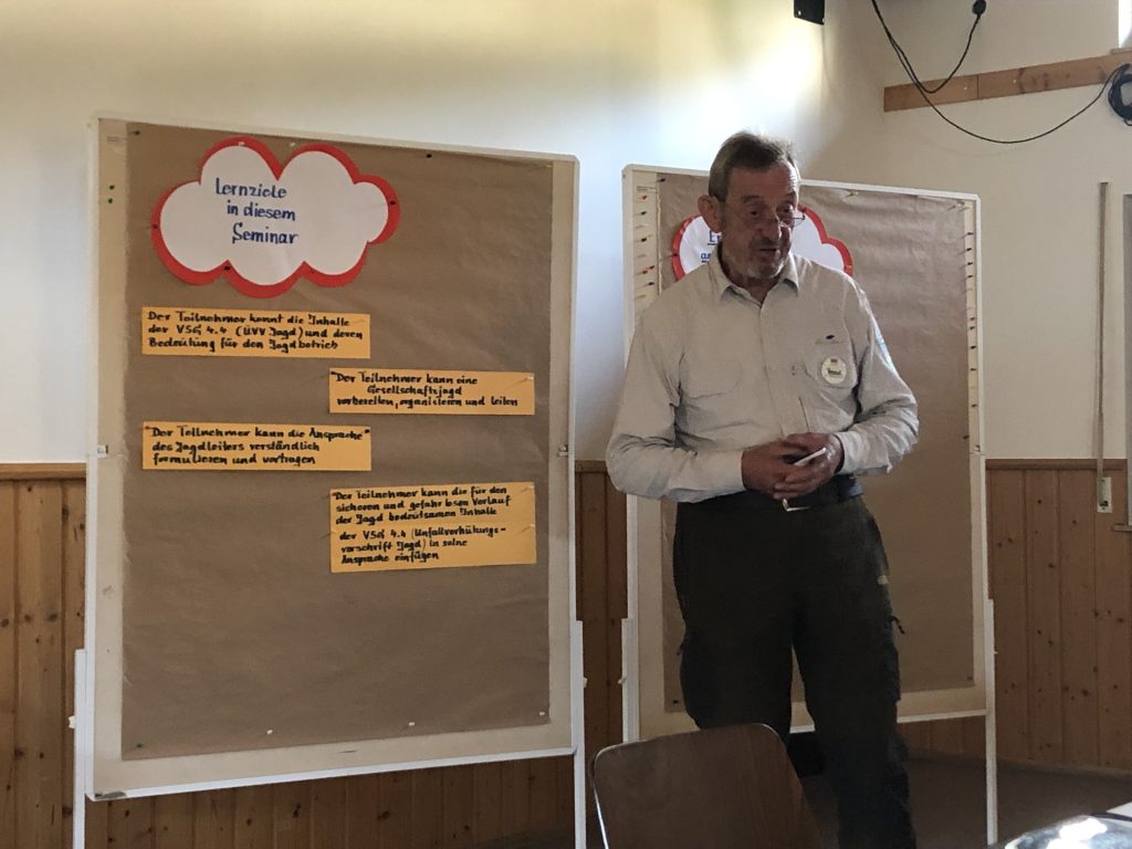 Bildungsreferent Bernd Ewering referierte im Laufe des Vormittags zum Thema Jagdarten: Wald-, Feld, Wasser-, Such-, Bau- und Maisjagd.  Den Schwerpunkt legte er auf das Thema Gesellschaftsjagden:  ab wann spricht man von einer Gesellschaftsjagd, was sind die Aufgaben des Jagdleiters, was muss er bei der Planung alles berücksichtigen? Was sagt die UVV „Jagd“, VSG 4.4 dazu?