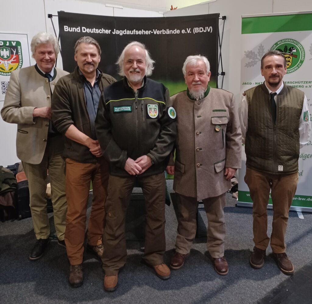 (v.l.n.r. Vorsitzender BDJV Hans-Joachim von Keßinger, Vorsitzender Dr. Marek Meder, Ausbildungsleiter Prof. Dr. Hans-Ulrich Endreß vom Jagd – Natur – Wildtierschützerverband Baden-Württemberg , Landesvorsitzender Peter Seelmann und Vorstandsmitglied Stefan Seelmann vom Jagdaufseherverband RLP)