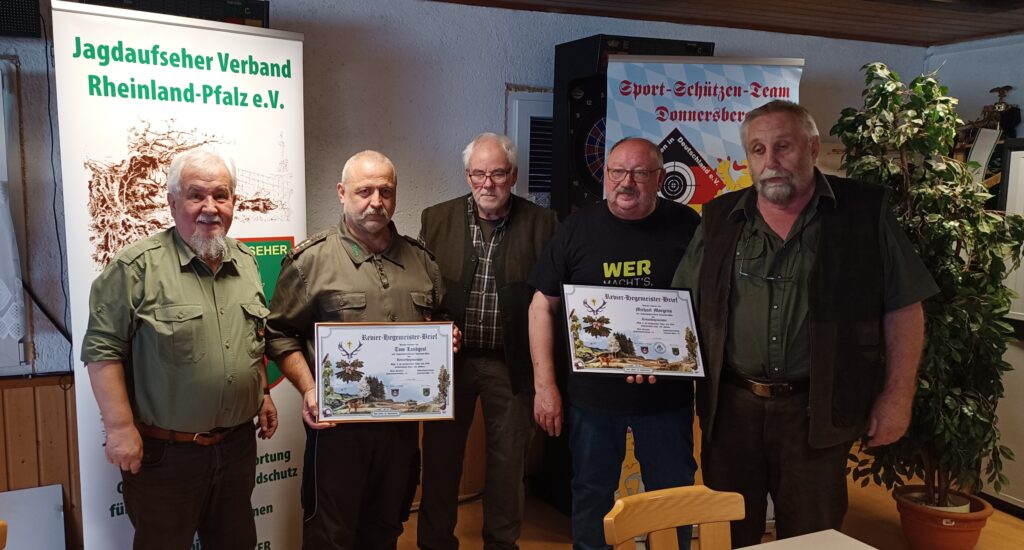 Beim Jagdaufseher-Stammtisch am 14. Oktober 2023, im Schützenhaus Schweisweiler, konnte Landesvorsitzender Peter Seelmann, auch im Namen des BDJV, die Revierhegemeister-Briefe überreichen. Fleiß und Ausdauer (12 Module, 120 Std., ca. 3.ooo km gefahren) haben sich gelohnt.