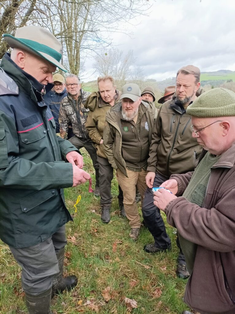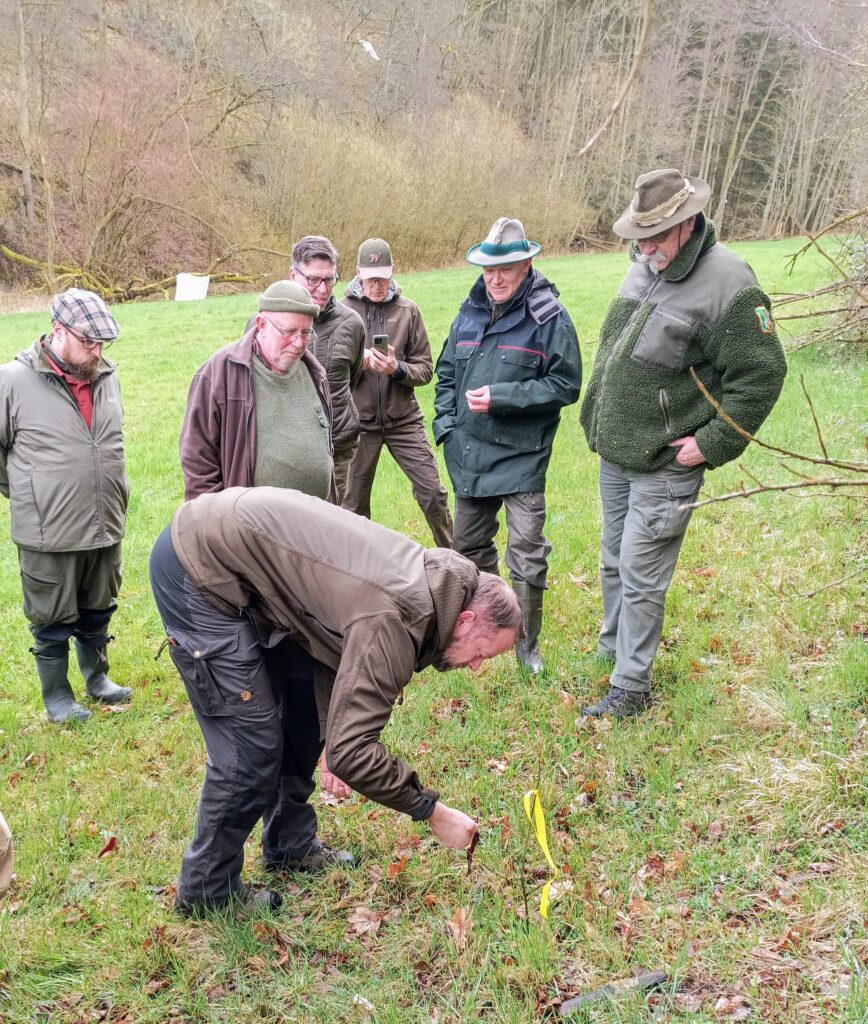 Erfolgreiche Abnahme der Revierhegemeister-Abschlussarbeiten im Anschluss an das Anschuss-Seminar durch die Prüfungskommission mit LV Peter Seelmann, stellv. LV Peter Schäfer und RHM Stefan Seelmann.