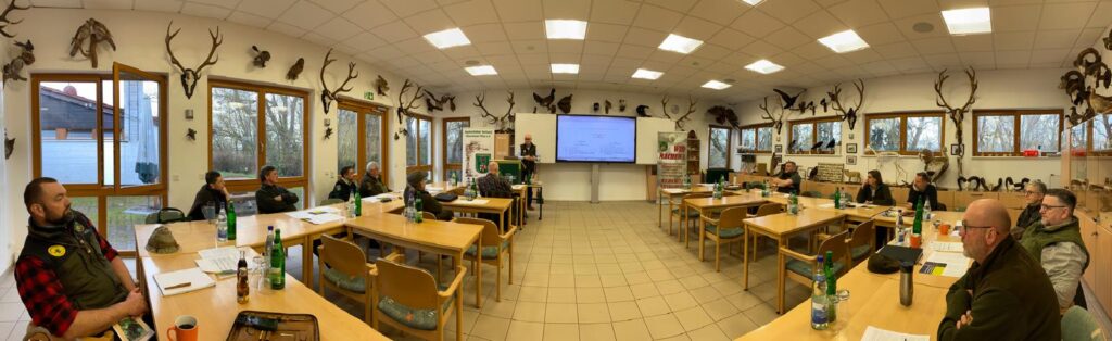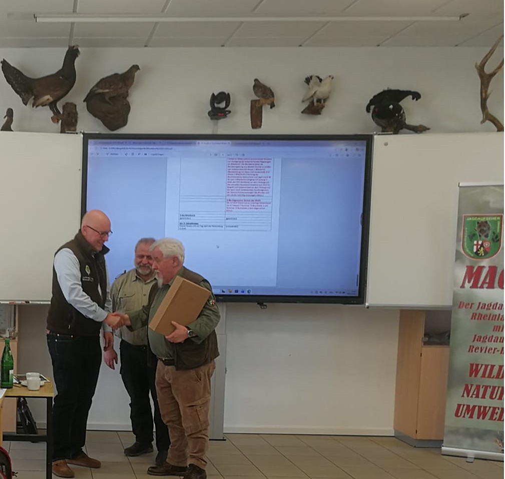 Für das Seminar „Jagdrechtliche Bestimmungen“ konnte Dieter Mahr, Präsident und Justiziar des Landesjagdverbandes Rheinland-Pfalz e V., Jäger, Fachanwalt, Revierpächter und Jagdvorsteher, als Dozent gewonnen werden. In jeder Hinsicht ein echter Gewinn! Im Konferenzraum des Landesjagdverbandes in Gensingen wurden am 28. Februar 2026 die Änderungen im Landesjagdgesetz vom 9. Juli 2025 gegenüber dem alten LJG besprochen. Ebenso war Thema die Aufnahme des Wolfs in das Bundesjagdgesetz, das voraussichtlich zum 1.4.2026 in Kraft treten wird. Landesvorsitzender Peter Seelmann überreichte dem Dozenten als Dankeschön ein Präsent. Ausbildungsreferent, Revierhegemeister Tom Landgraf, war für die Organisation der Fortbildungsveranstaltung verantwortlich.